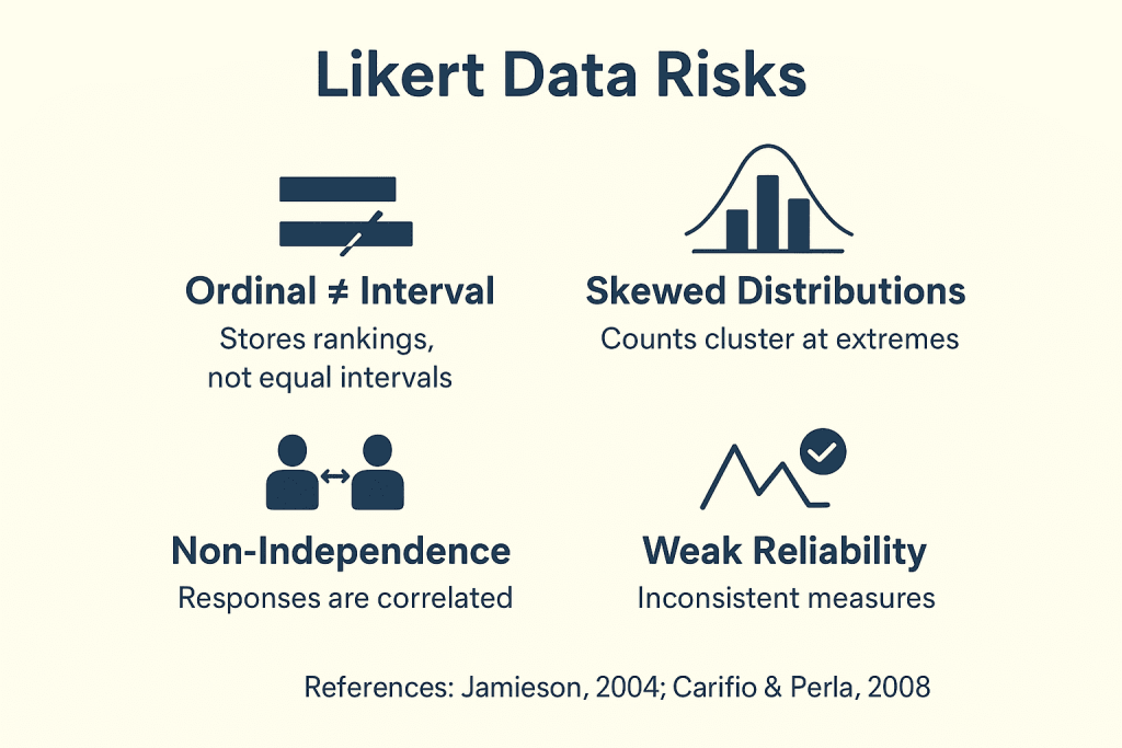 A 1–5 Likert scale is ordinal. “3” is not mathematically twice as strong as “1.” Yet researchers frequently apply t-tests, ANOVA, or regression as if distances are equal. This misclassification inflates effect sizes and distorts findings (Jamieson, 2004).